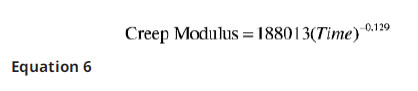 The creep data from this test can also be reformatted to be displayed as Creep Modulus vs. Time. Using the same method described above for extrapolating strain vs. time data, we get the creep modulus formula below (Equation 6). Modulus is then extrapolated to 1,000 hours (see Figure 6).