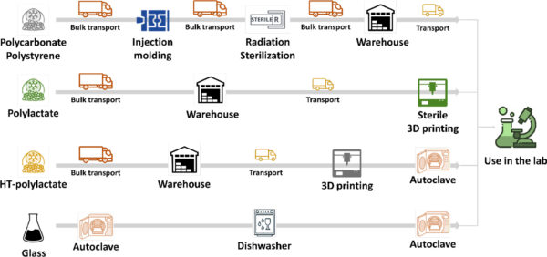 Life science research requires sterile, single-use plastics for items such as gloves, pipettes, and shake flasks. This industry accounts for over five million tons of global plastic usage annually. This creates issues for achieving a sustainable, circular economy for plastics. One study suggests that sterile, on-site printing of polylactic acid (PLA) could be a solution to this problem. This can drastically reduce CO2 emissions. This promising solution is cost-effective and has negligible implementation costs for life science research institutions.